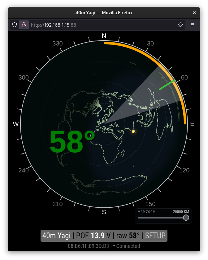 | Web interface with azimuthal control map, selectable URL bitmap or Vector map, with optional grayline and Sun position | Gyrotator Optional controller on external hardware 5Stack FIRE YouTube video | MQTT (mqtt-wall include) |