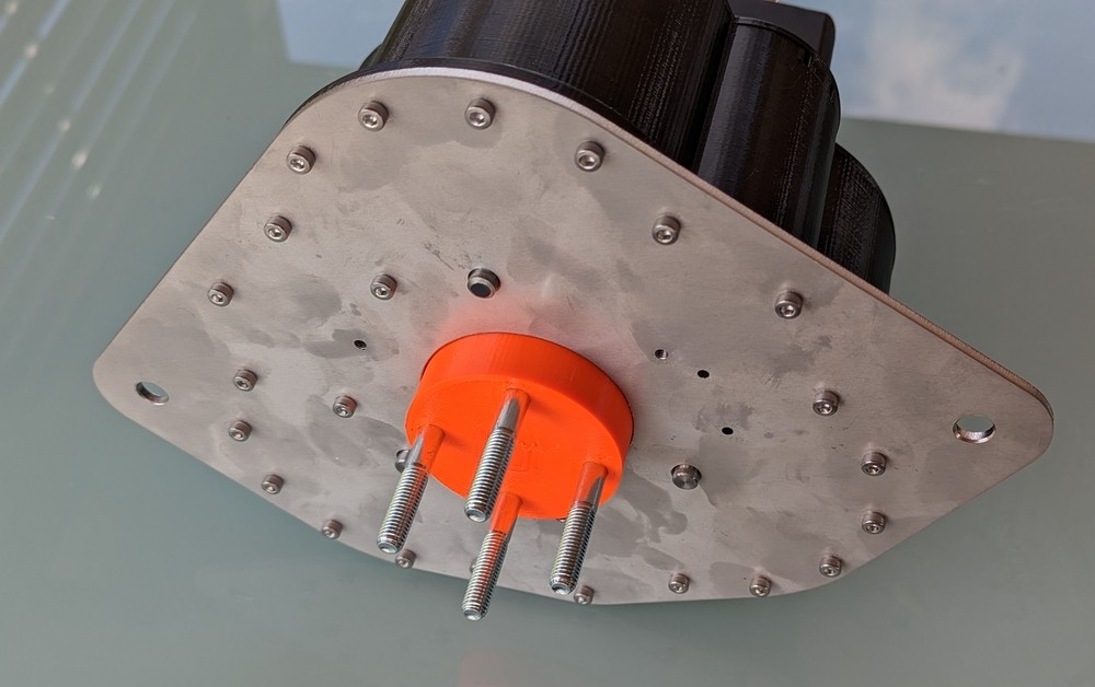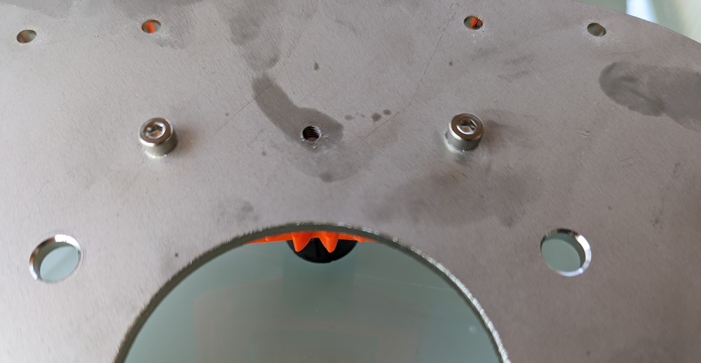 Place the main stainless steel plate on the rotator body so that the outer axes pass through the plate outwards and secure 21 M4x16 screws. Tighten the screws sensitively, they are cut directly into the plastic