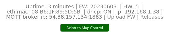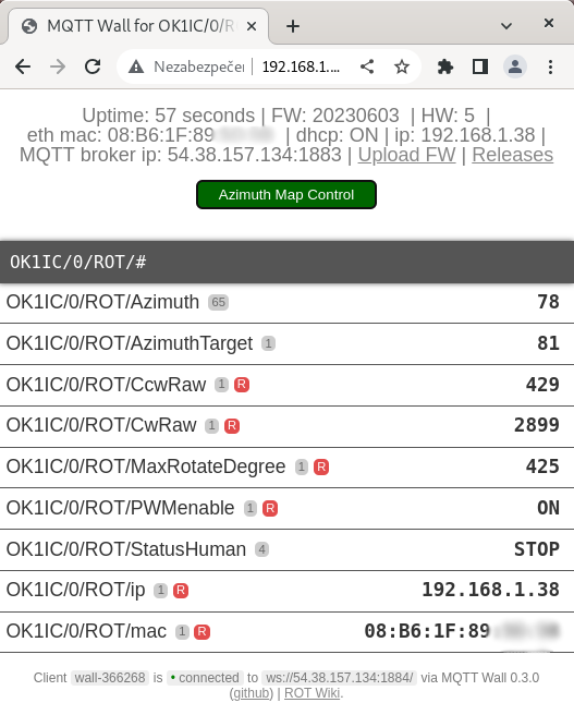 - The first page contains an information header, including a link to the Firmware Upload page and the Release page on GitHub. Give green the button of the link to the control page of the rotator. Below it is the web MQTT client (credit MQTT wall) displaying the data sent or received by the rotator from the MQTT broker - data used to control or debug the rotator.