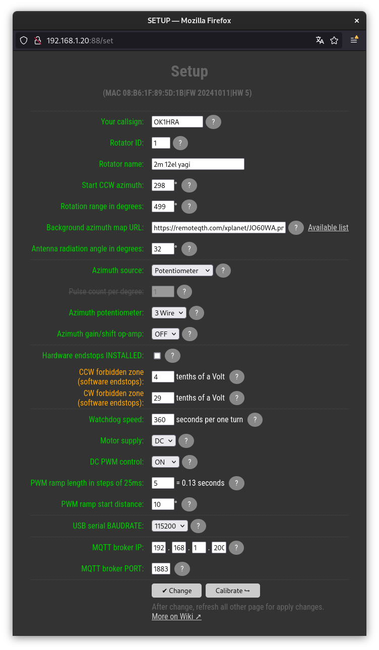 - CW/CCW forbidden zone (software endstops), are values of the range of forbidden zones in millivolts. the entire range of the rotator represents a voltage of 0 to 3.3V. The setting value will appear in the Calibration page as a yellow area at the edges of the range. If the rotator is set correctly, it only allows movement in the direction from the edge to the center. Keep the protection zone large enough to prevent damage to the rotator.