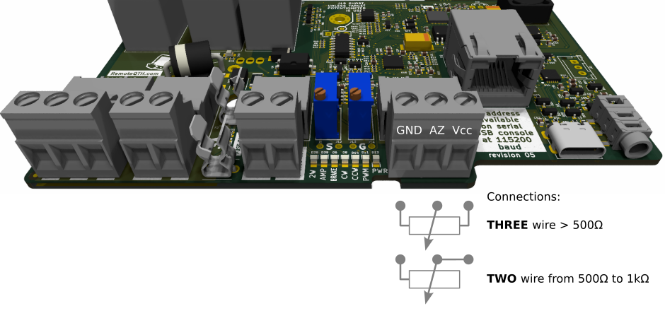 - The azimuth potentiometer is a choice between two and three-wire variants. The two-wire variant uses a constant current source of 9mA and enables the connection of a potentiometer smaller than 1kΩ. The three-wire variant uses a constant voltage source of 9V and enables the connection of a potentiometer of 500Ω or more. You can find the connection in the Azimuth potentiometer section.